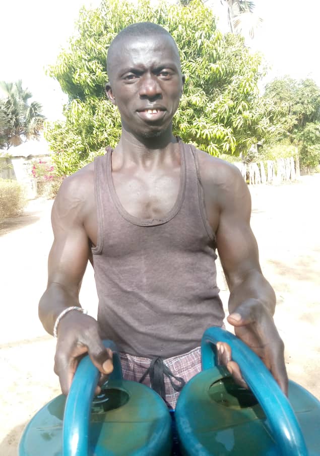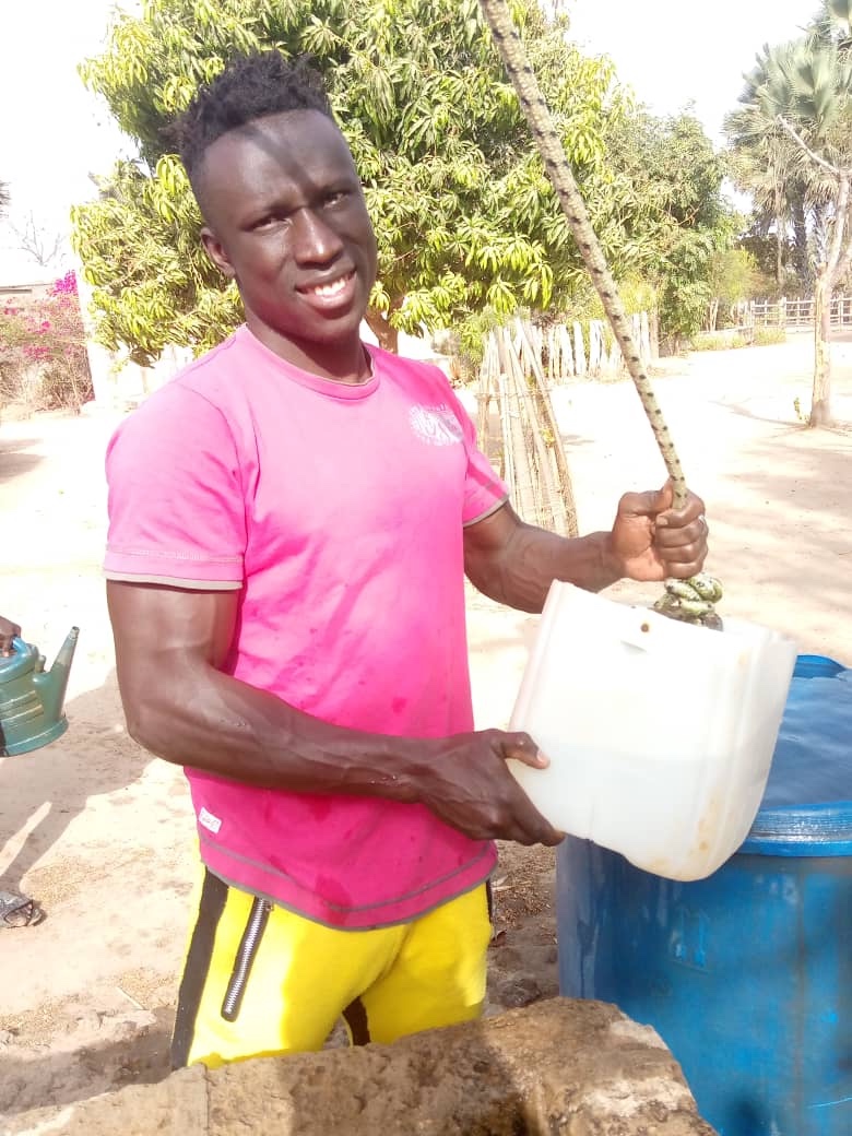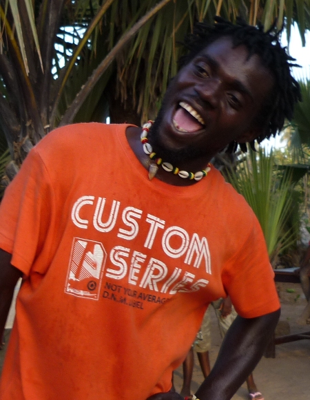 Lamin doet dagelijks op de fiets onze boodschappen in Gunjur. Hij weet zijn weg naar de juiste groenten en vis feilloos te vinden. Daarnaast is hij een vaste entertainer bij de ambiances.